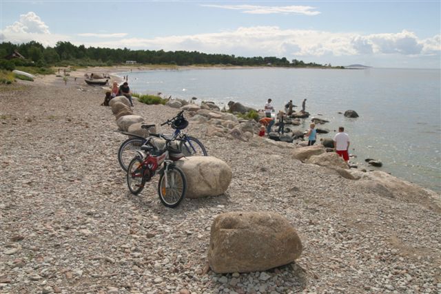 BADSTRAND VID BYXELKROK. I BAKGRUND BLÅ JUNGFRUN.