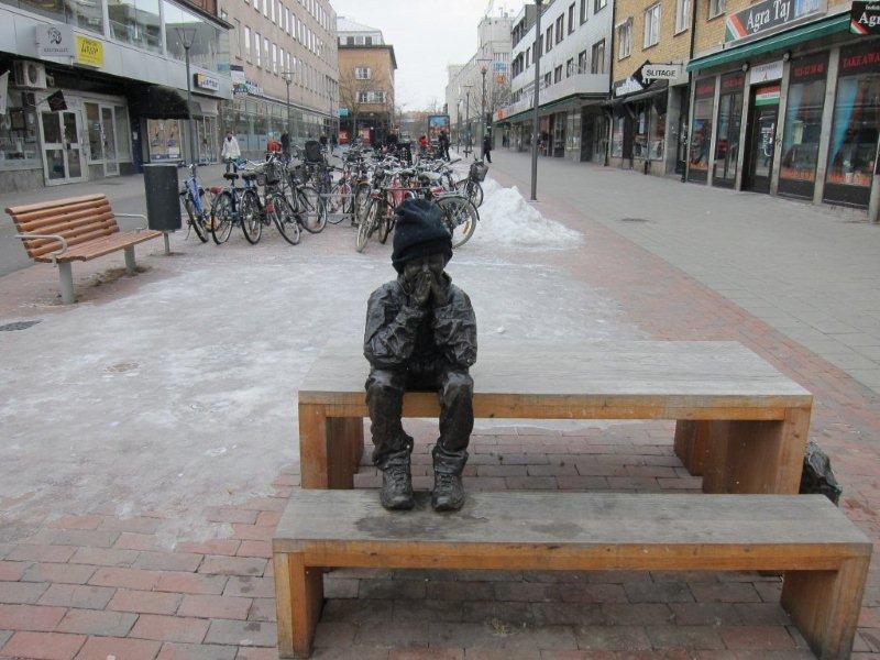 Skulptur på Smedjegatan i Västerås. Gzim har fått en mössa denna kyliga vårvinterdag!